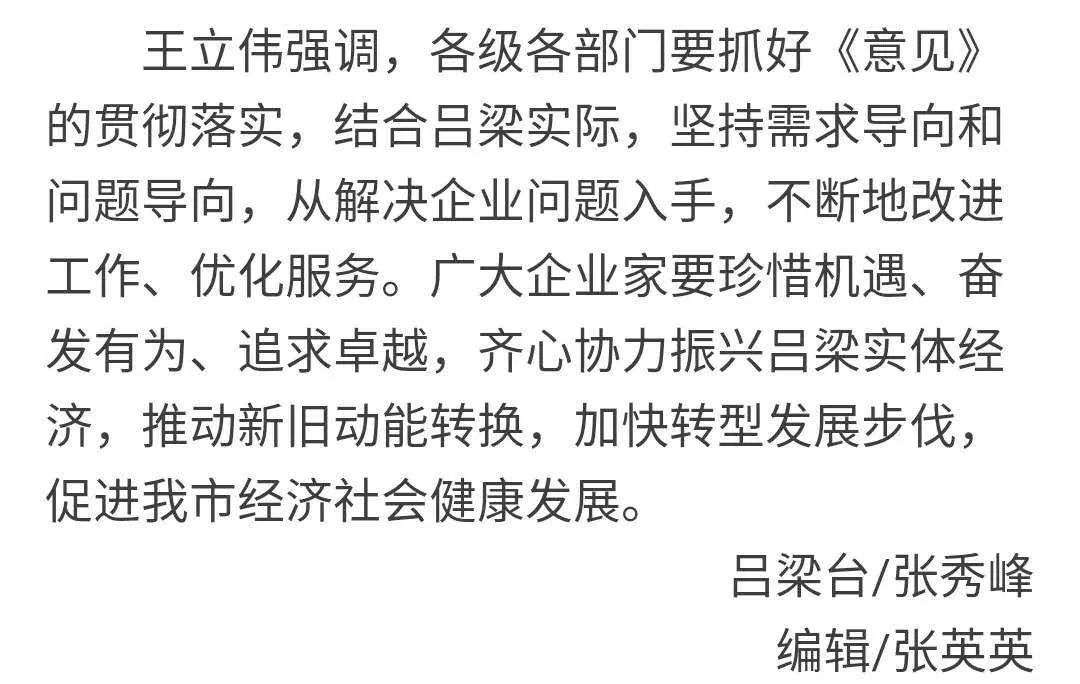 導(dǎo)語:10月13日,市委書記李正印主持召開我市深入學習貫徹落實中共中央、國務(wù)院《關(guān)于營造企業(yè)家健康成長環(huán)境弘揚優(yōu)秀企業(yè)家精神更好發(fā)揮企業(yè)家作用的意見》(下稱《意見》)座談會,共商呂梁經(jīng)濟發(fā)展大計。市長王立偉、市人大常委會副主任梁來茂、副市長楊巨才出席會議。9大產(chǎn)業(yè)13個行業(yè)協(xié)會負責人參加會議。